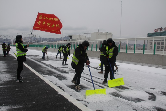 在城陽(yáng)區(qū)新機(jī)場(chǎng)高速連接線項(xiàng)目,公司”青年突擊隊(duì)”發(fā)揚(yáng)“攻堅(jiān)克難”的巨源精神,不畏嚴(yán)寒,組織項(xiàng)目部全體員工和勞務(wù)隊(duì)伍共同投入到清雪除冰行動(dòng)中。